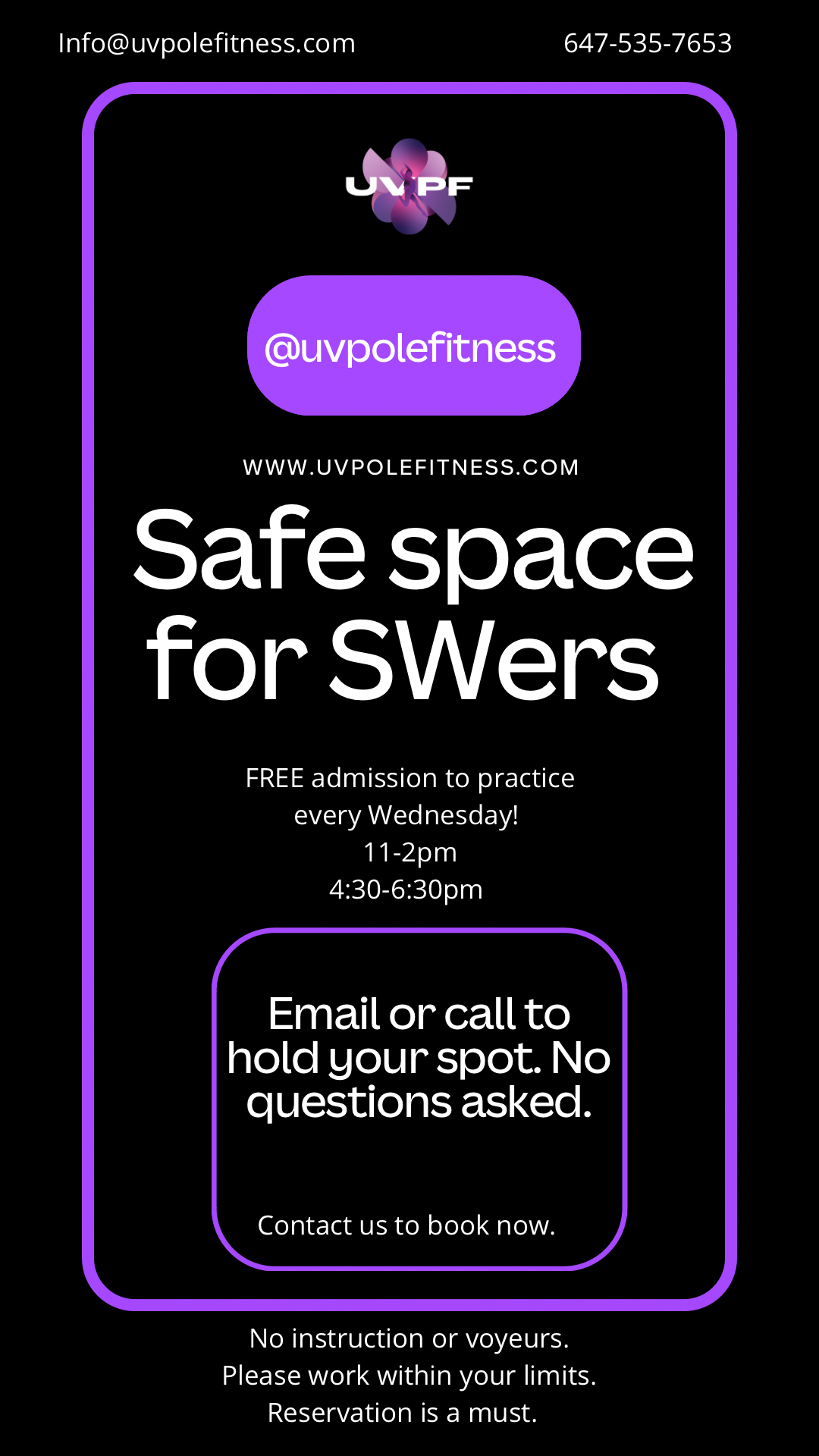 We specialize in pole and circus arts fitness and dance including pole, lollipop lyra, aerial lyra, silks, pole and hammock, and erotic movement. Registration opens up 5 days before class time. Check it out.